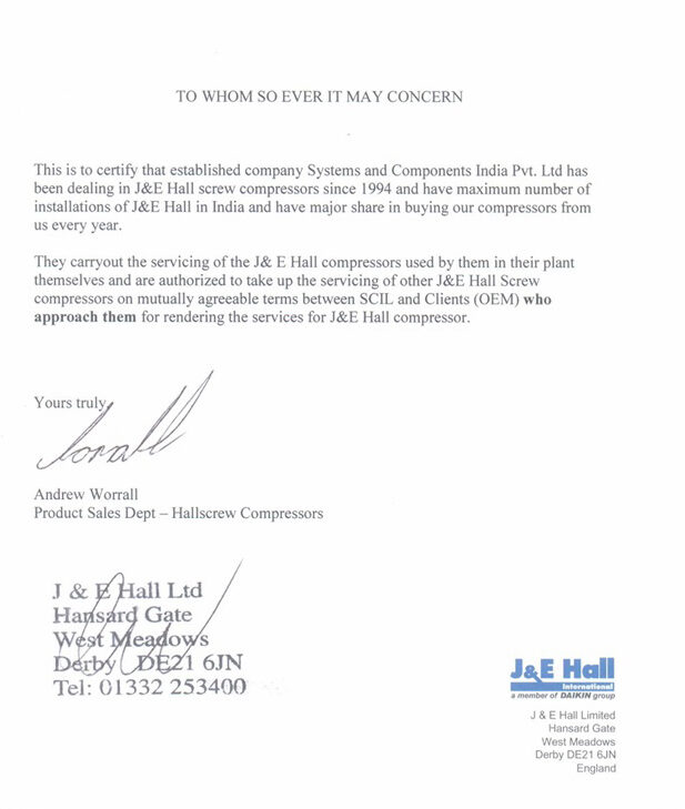 We are the first OEM authorised by J&E HALL, UK, to carryout servicing of their compressors.
